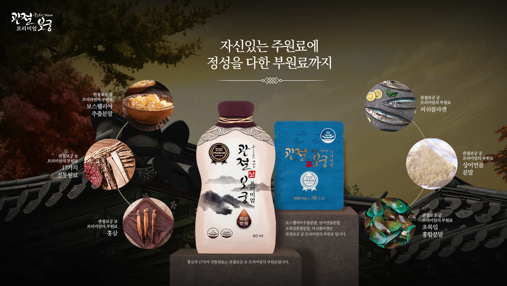 관절 건강에 효능이 있는 건강기능식품으로, 가수 김연자 씨가 모델로 활동하고 있습니다. 한약처럼 마시는 '보’와 알약 형태의 '궁’으로 판매됩니다.