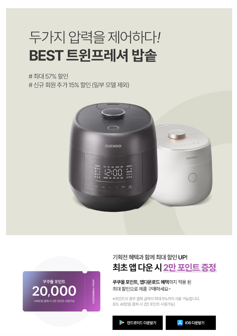 [앱 다운 기획전] 쿠쿠몰 앱 다운로드 이벤트! 앱을 통한 신규 가입 시 2만 포인트 증정!